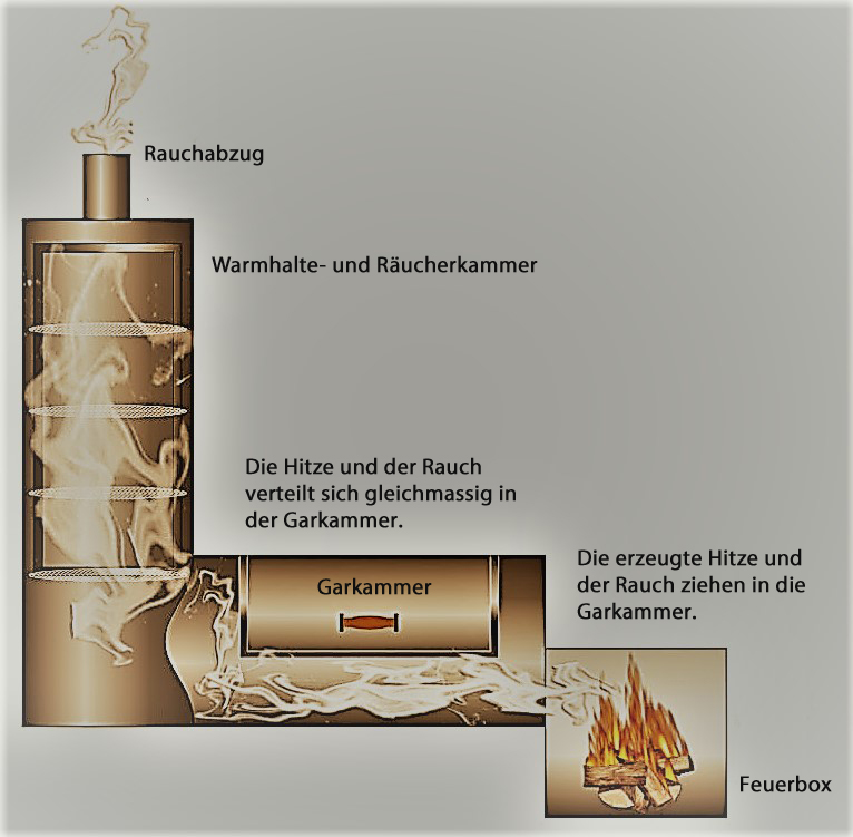 Räuchern Durch Schliessen der Kaminklappe und minimale Luftzufuhr kann in der Garkammer oder im Rauchrohr (bei Grossmodellen) hervorragend geräuchert werden. Die ideale Temperatur liegt zwischen 30° und 90°C.