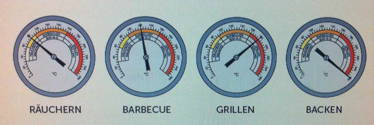 Räuchern Durch Schliessen der Kaminklappe und minimale Luftzufuhr kann in der Garkammer oder im Rauchrohr (bei Grossmodellen) hervorragend geräuchert werden. Die ideale Temperatur liegt zwischen 30° und 90°C.